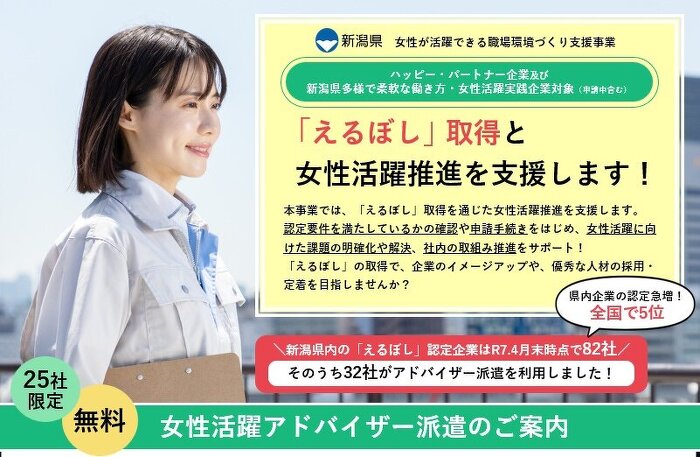 女性活躍アドバイザーが、女性の活躍推進状況が優良な企業を認定する「えるぼし」の取得や、女性活躍における課題の解決・取組みの推進を支援します。