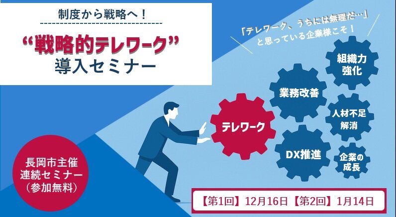 | 対象/定員 | 【対象】長岡市内に本社または事業所を有する企業の ・経営者 ・人事担当者 ・テレワークを導入したい部署の担当者 等 【定員】先着30名/1企業2名まで ※第1回と第2回で参加者が異なっても構いません |