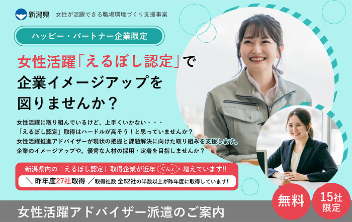 本事業を利用して、令和6年度内に「えるぼし認定」を取得した場合、新潟県から助成金の支給されます。(30万/社 予定)
