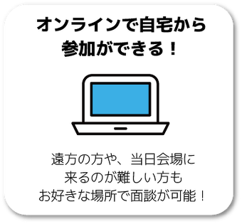 来場される方は事前申込み不要!当日は会場参加企業のブースを自由に回り、気になった企業と面談ができます。また、事前申込みを行えば、オンライン参加企業とオンライン面談することも可能です。※会場に設置するオンライン面談専用ルーム(面談用PC、ヘッドセット、Wifi完備)利用可能。